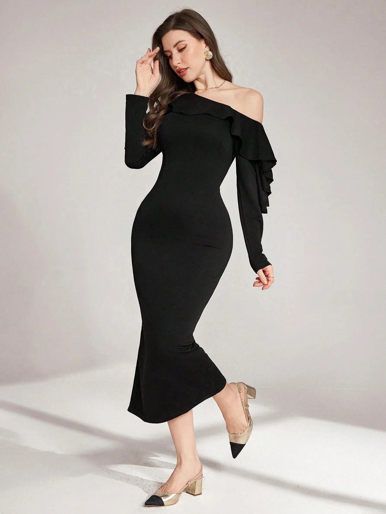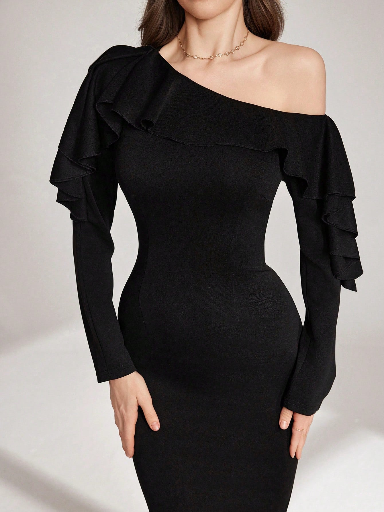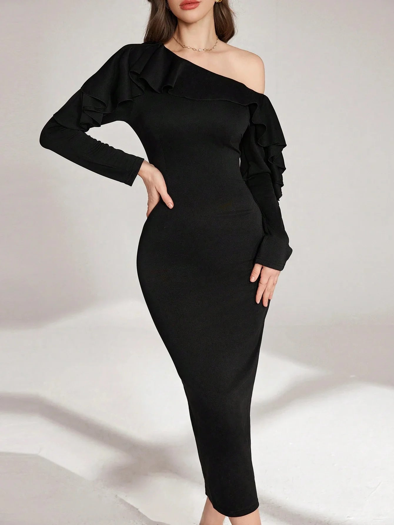 ASYMMETRICAL SHOULDER RUFFLE TRIM WAIST CINCHED WAIST MIDI DRESS