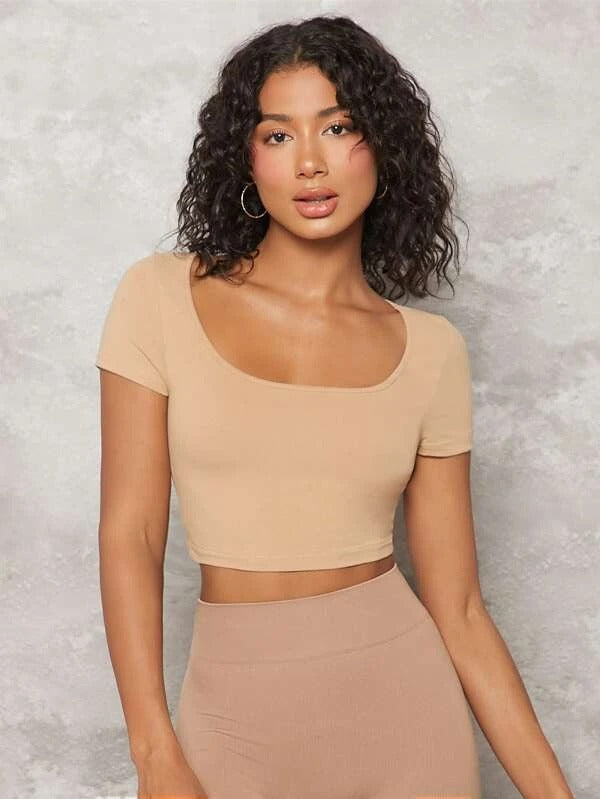 BASICS SQUARE NECK SOLID TEE-BEIGE