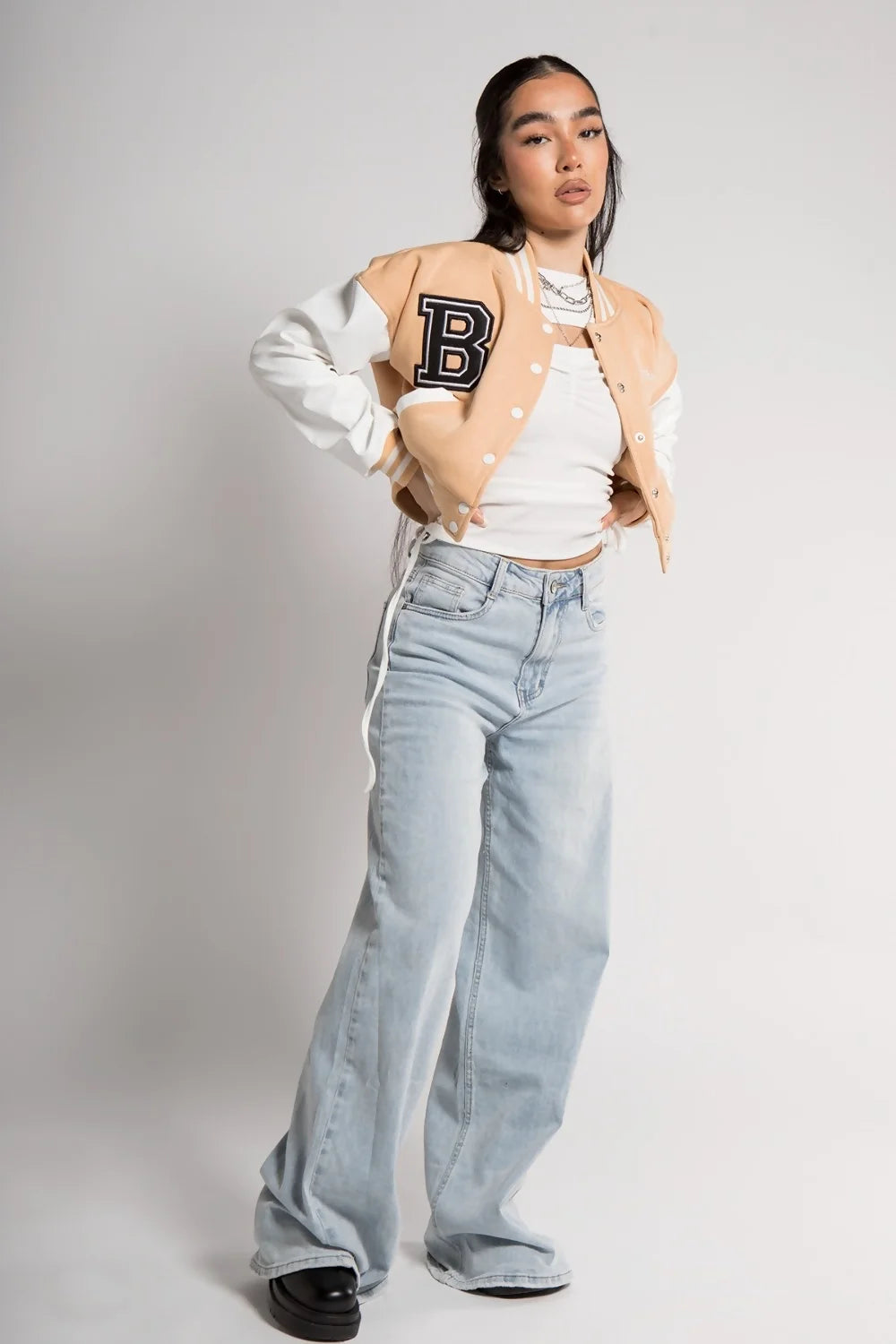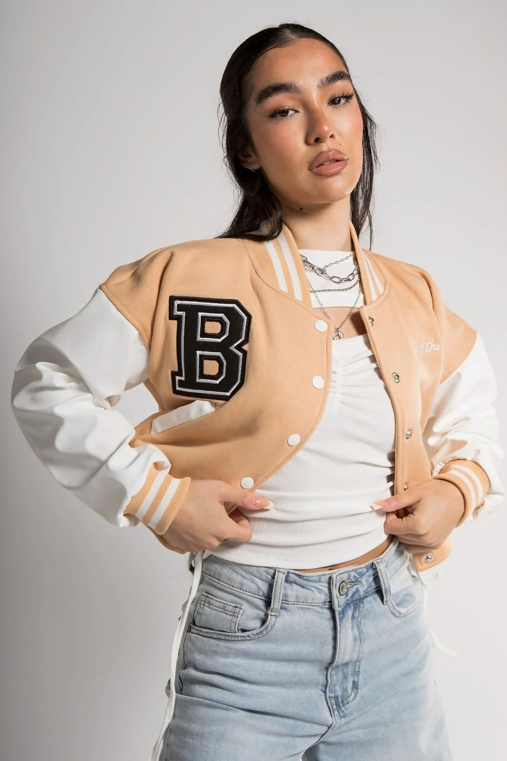 BEIGE VARSITY GRAPHIC FAUX LEATHER SLEEVE BOMBER JACKET
