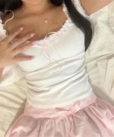 Summer Top for women has short sleeves, lace trim, bow decor, square neck, slim fit, cropped length, cottage milkmaid crop top, simple solid color never out of fashion.