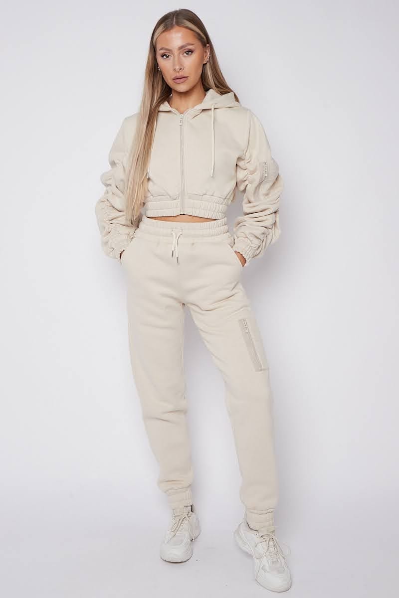 • Featuring a boxy fit cropped ruched hoodie with pocket details cuffed joggers and elastic in hem and cuff & cotton draw cord with tipping