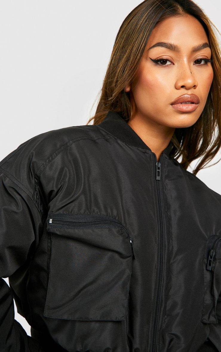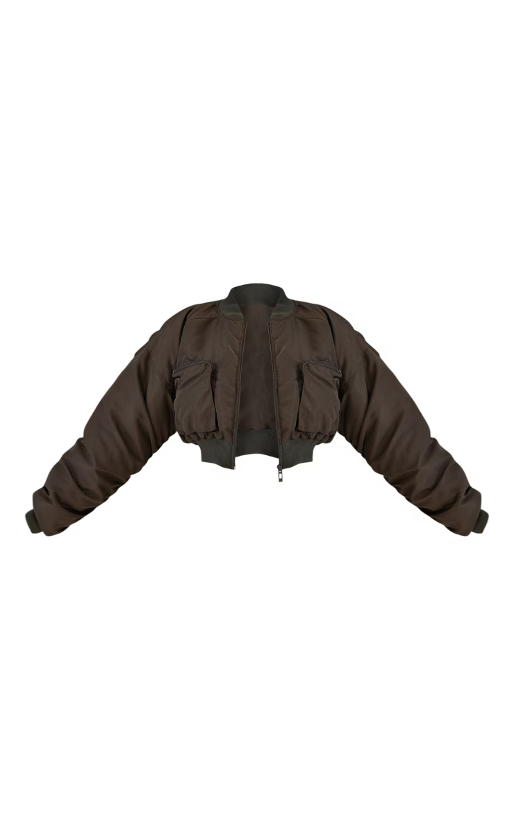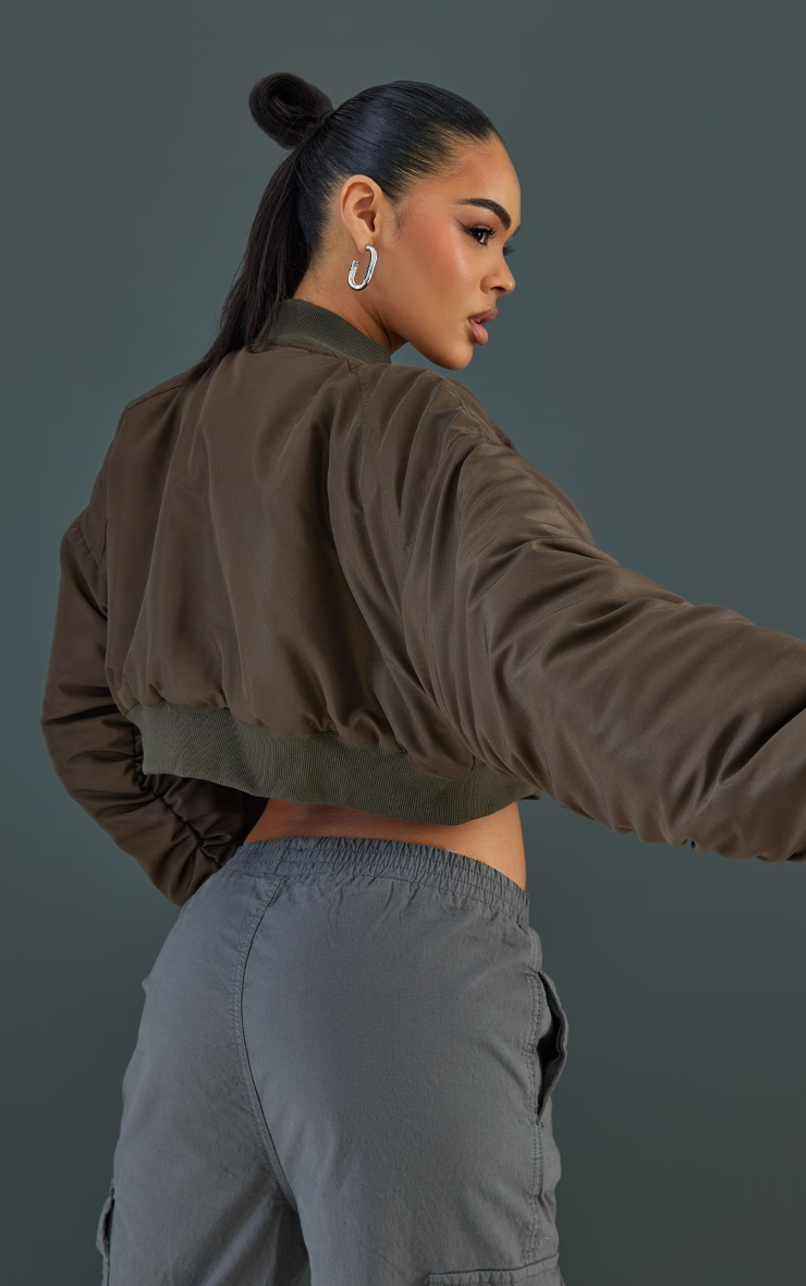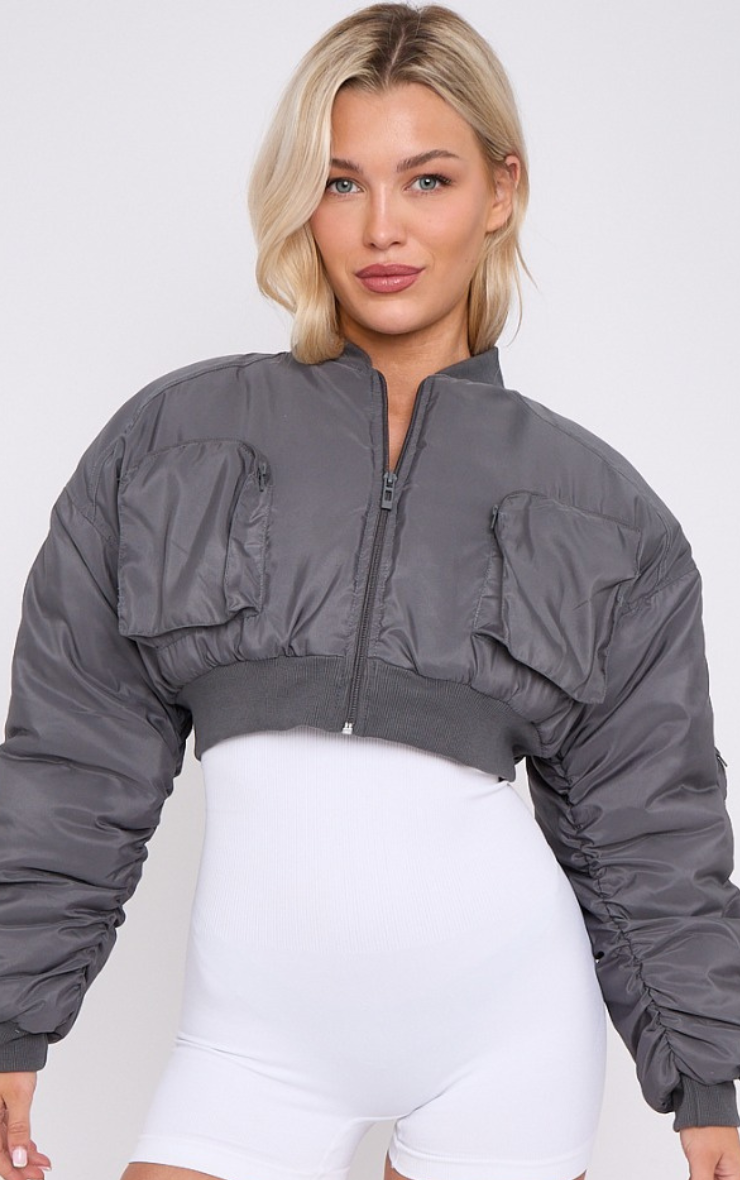 CROPPED RUCHED SLEEVE UTILITY POCKET BOMBER JACKET