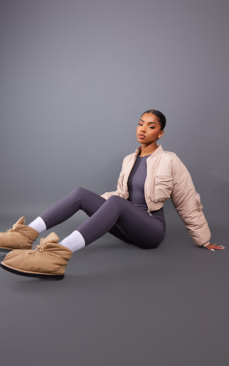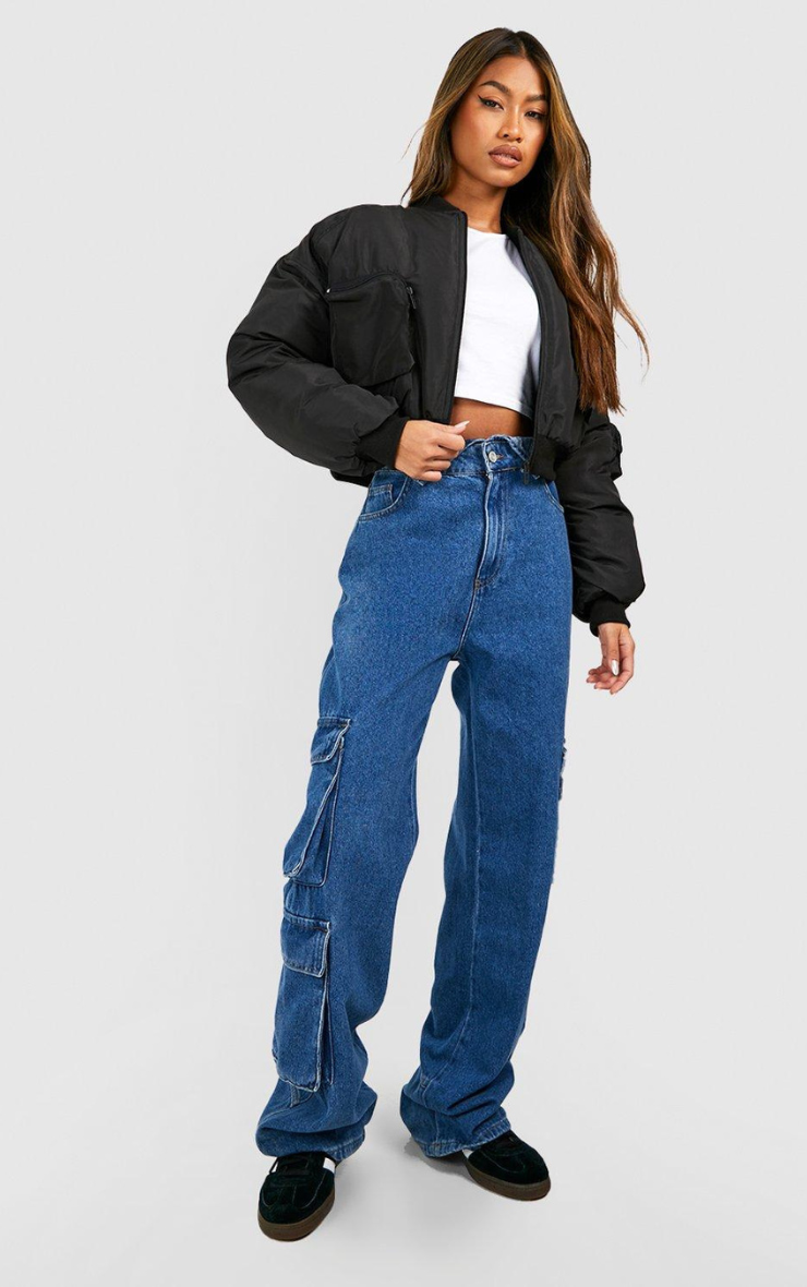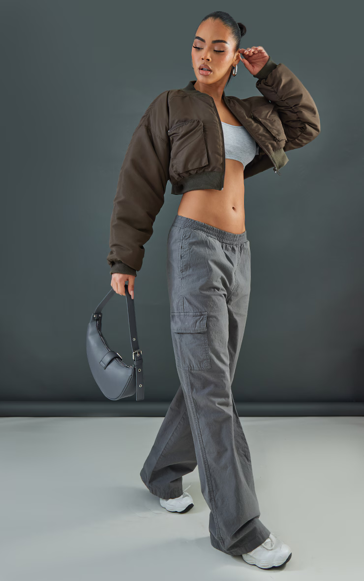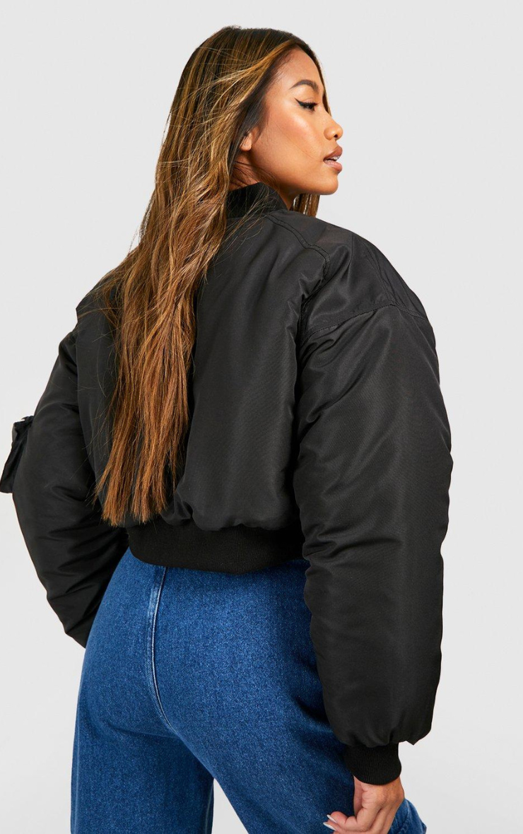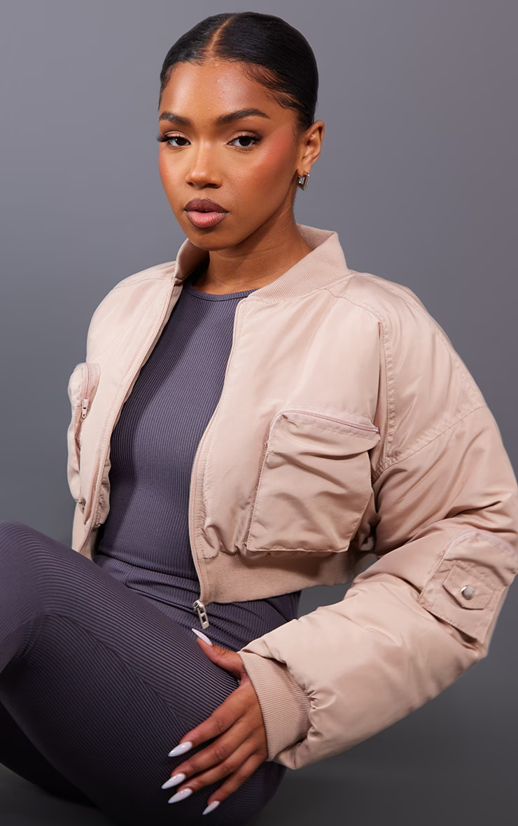 CROPPED RUCHED SLEEVE UTILITY POCKET BOMBER JACKET