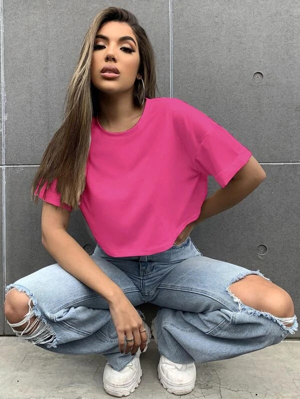 DROP SHOULDER SOLID TEE-FUCHSIA