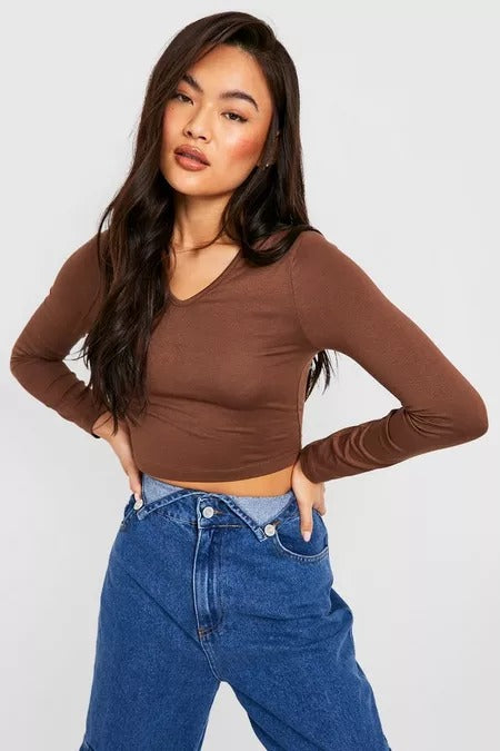 LONG SLEEVE V NECK CROPPED TOP-DARK BROWN