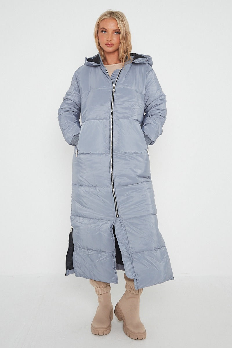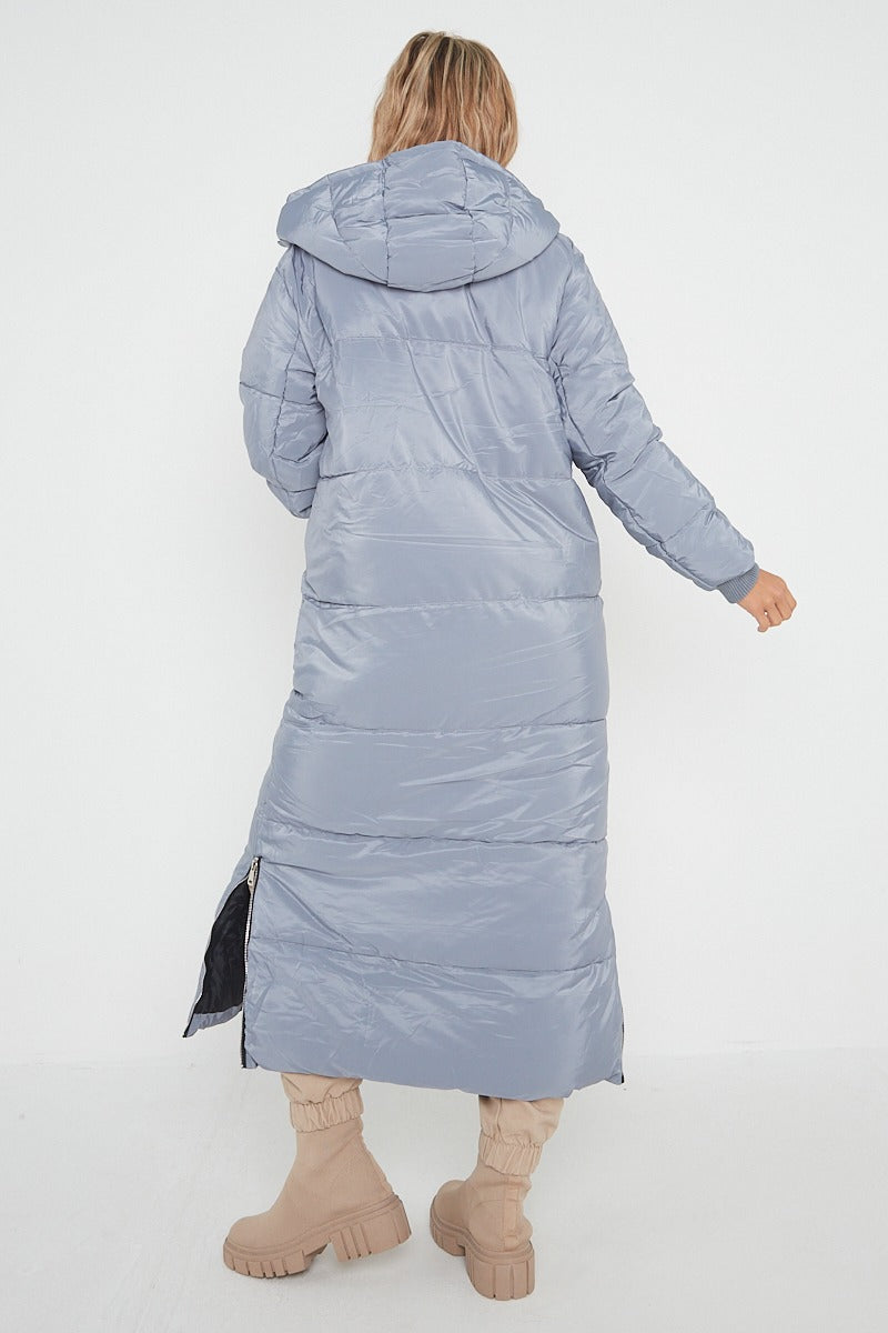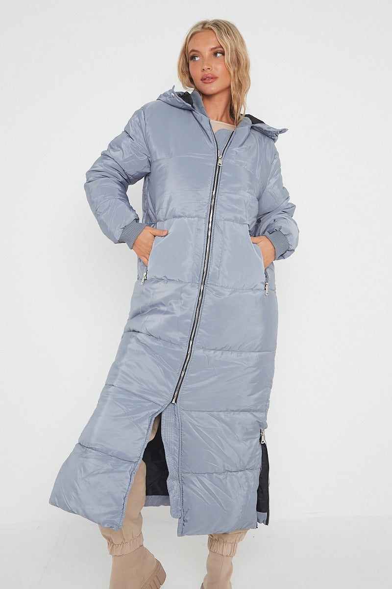 MAXI ZIP DETAIL PUFFER LONG JACKET-GREY