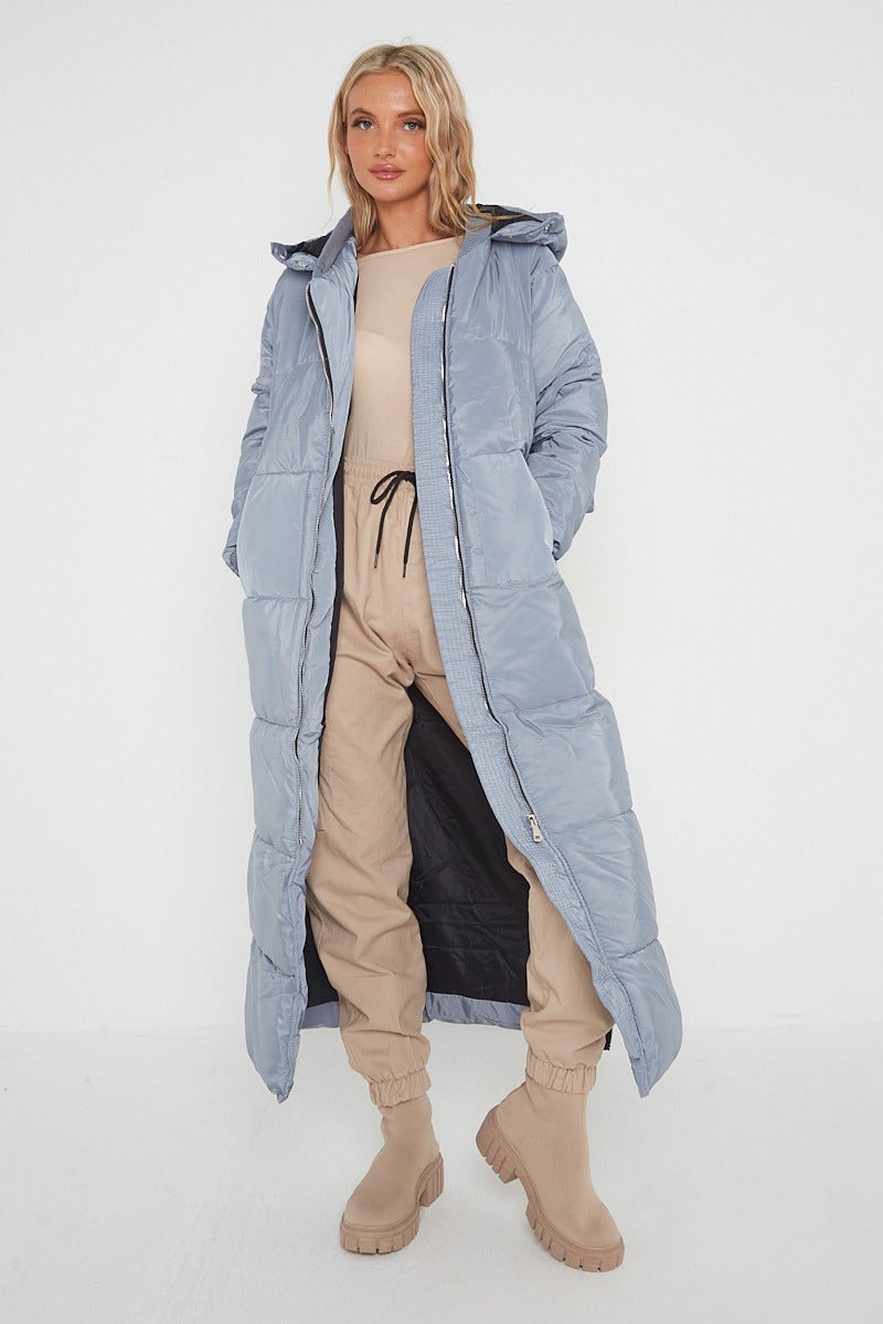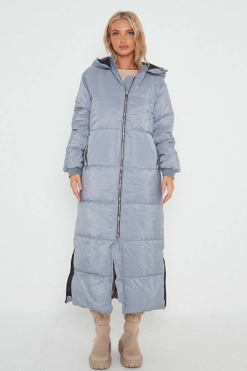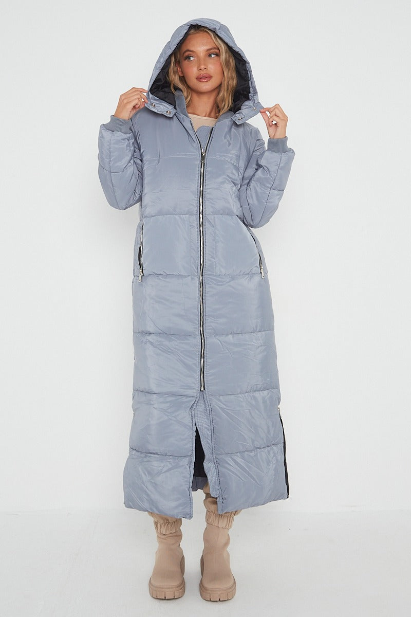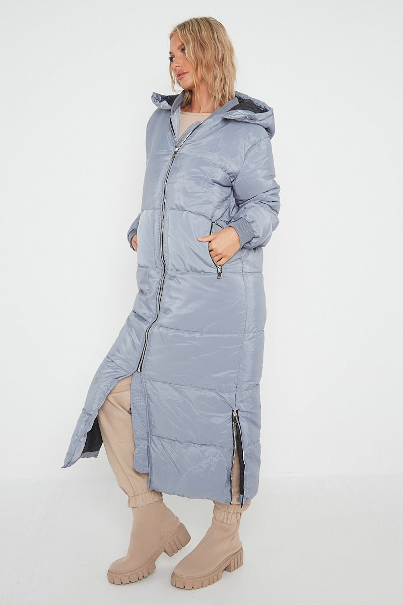 MAXI ZIP DETAIL PUFFER LONG JACKET-GREY