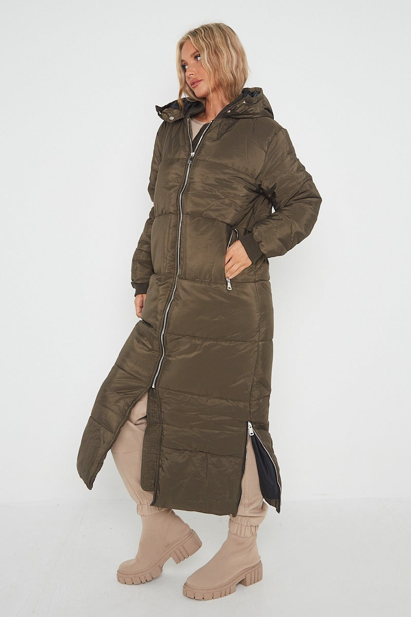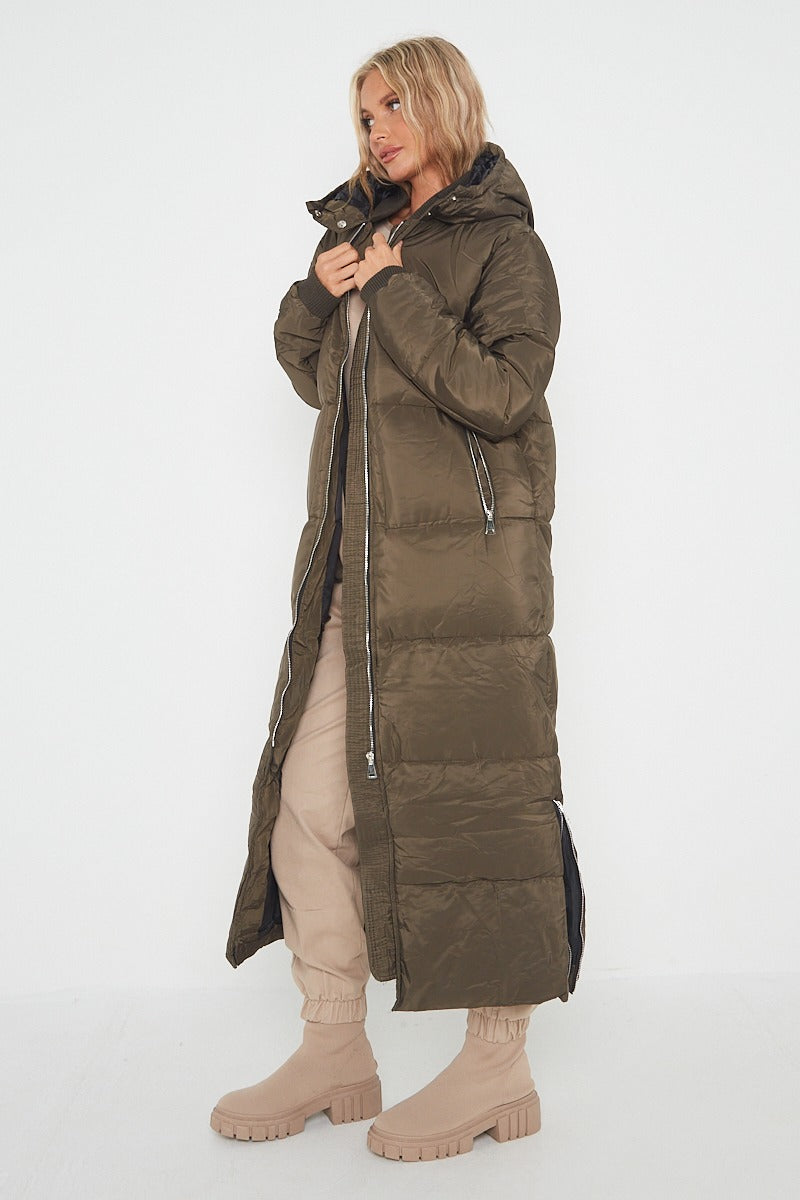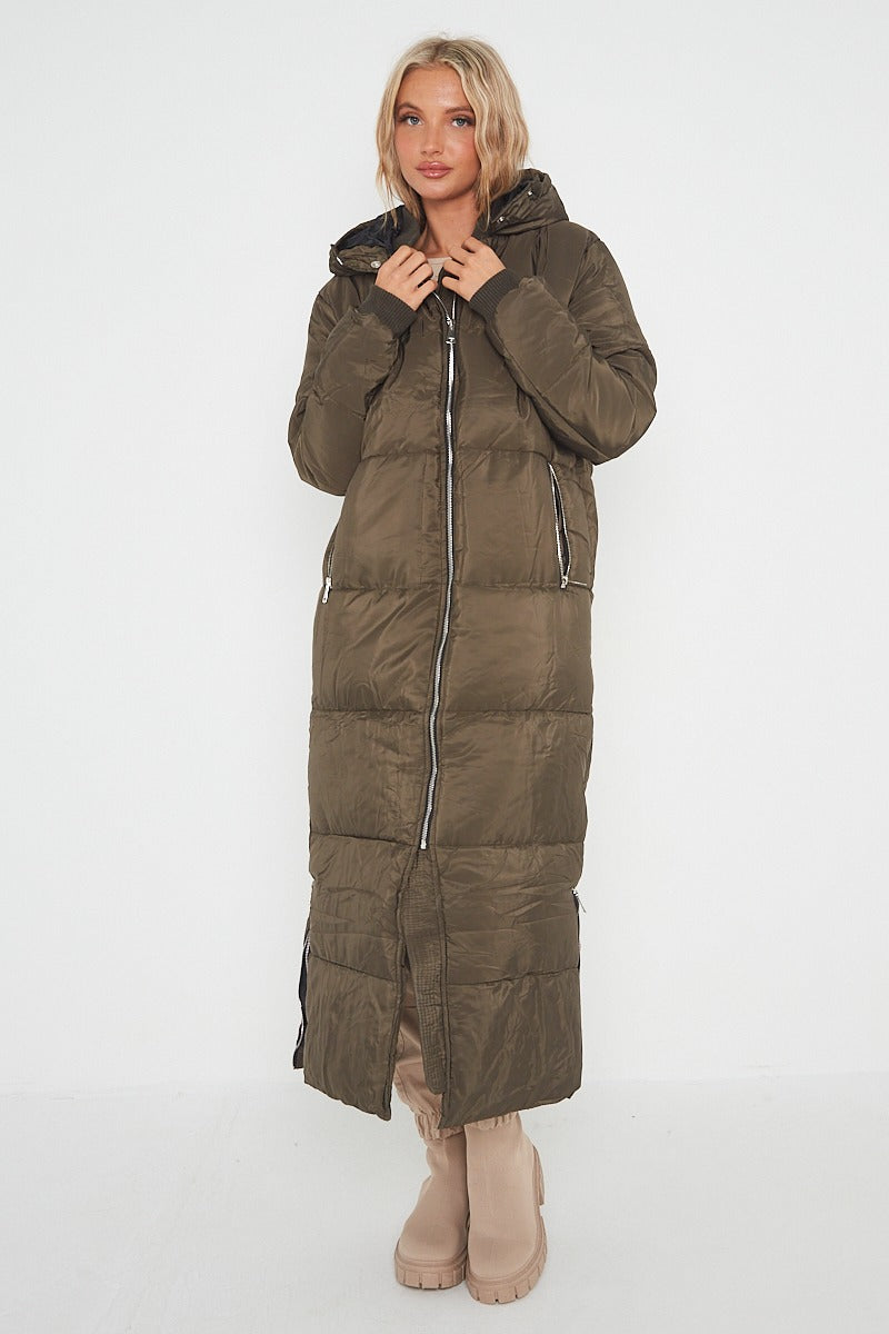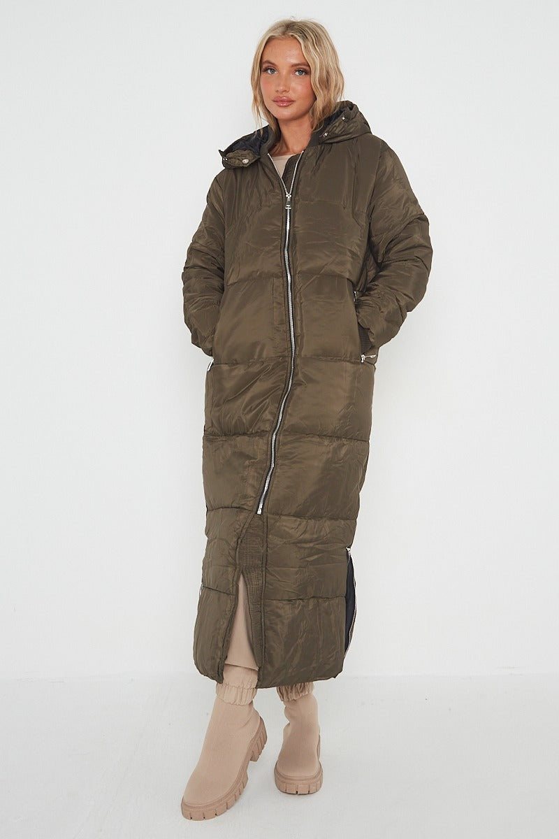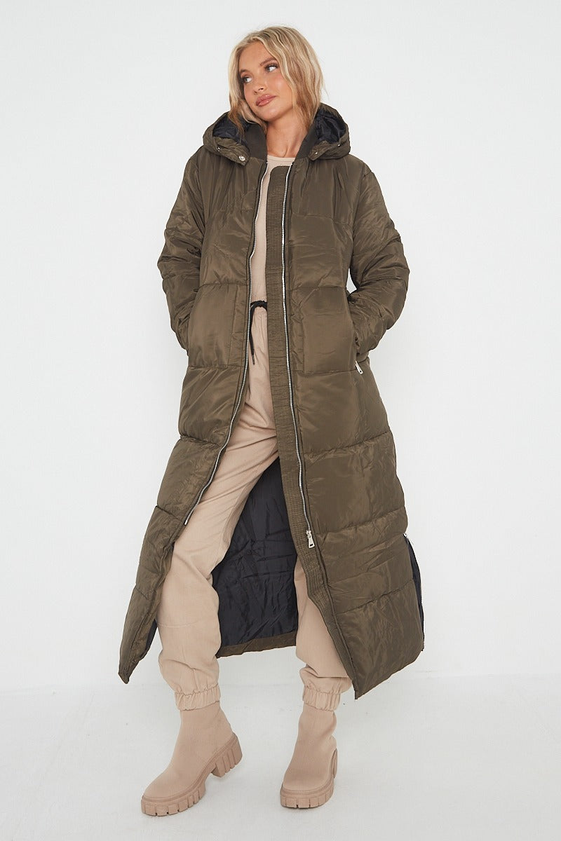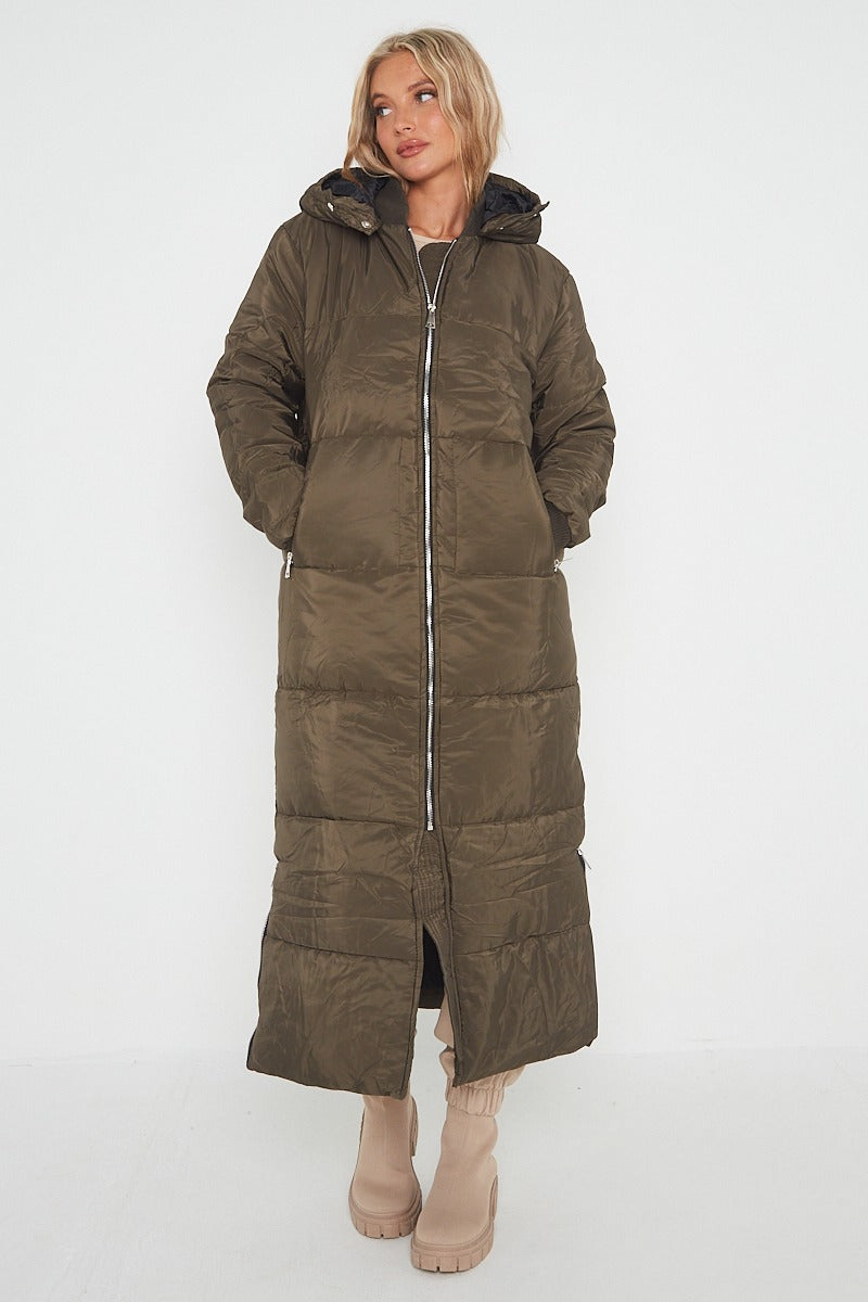 MAXI ZIP DETAIL PUFFER LONG JACKET-OLIVE