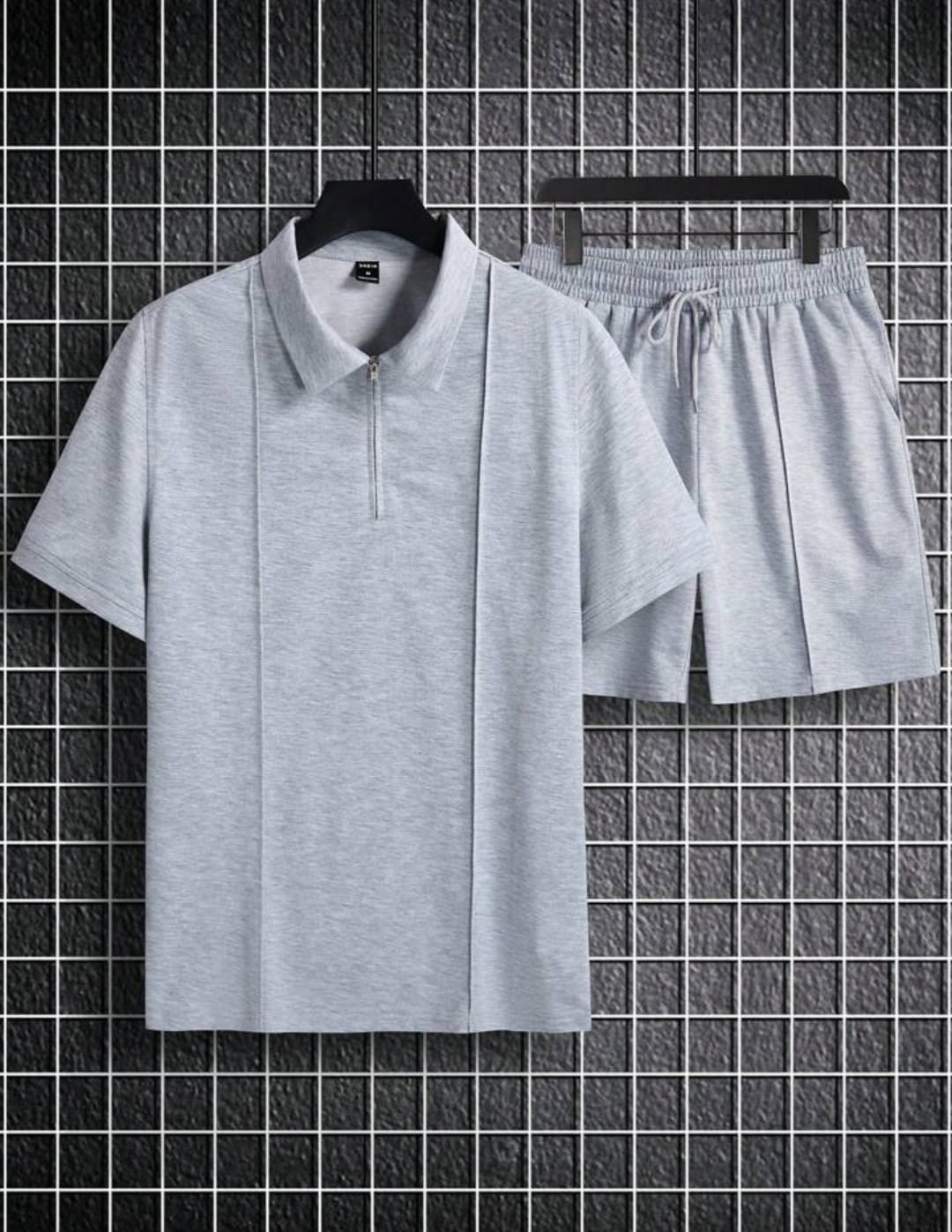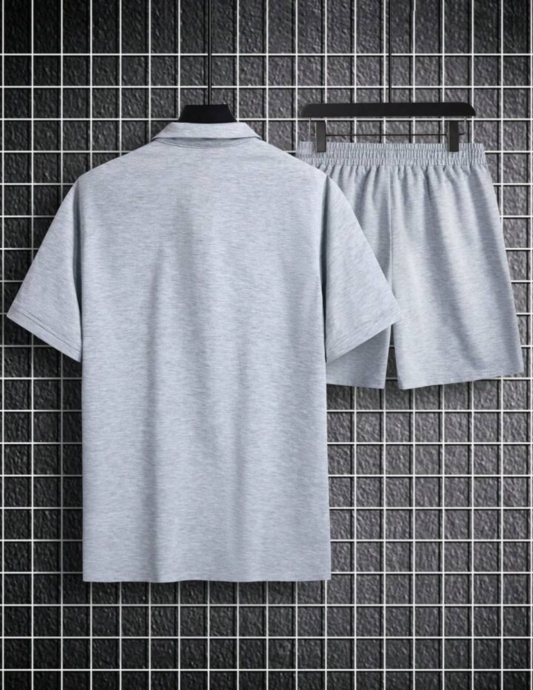 MEN SOLID COLOR TURN-DOWN COLLAR CASUAL SHORT SLEEVE T-SHIRT AND DRAWSTRING SHORTS SET