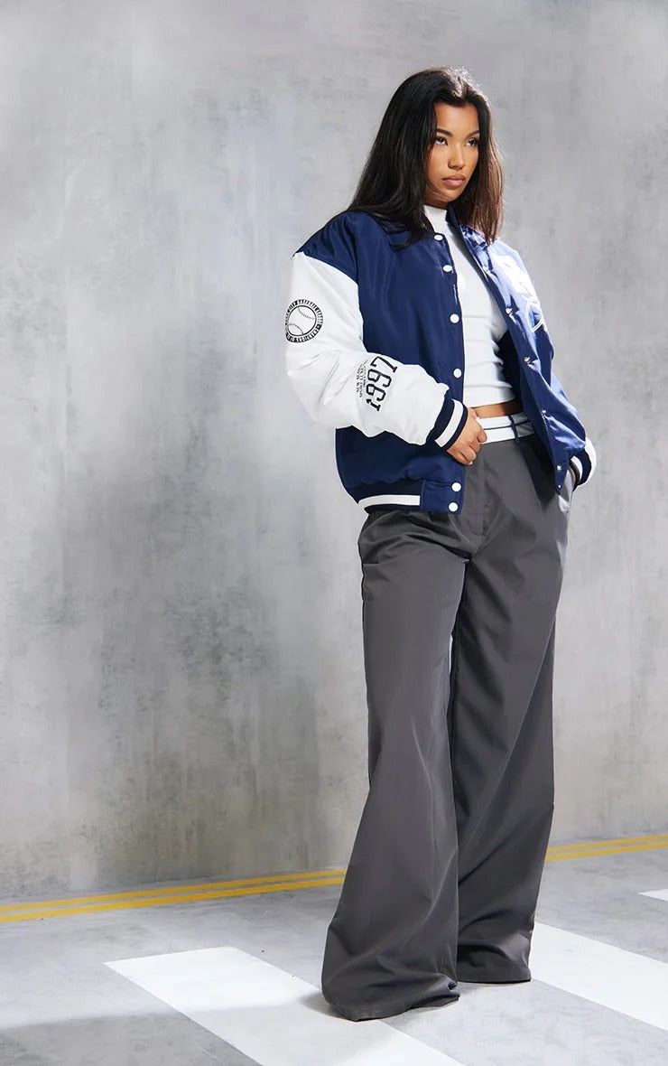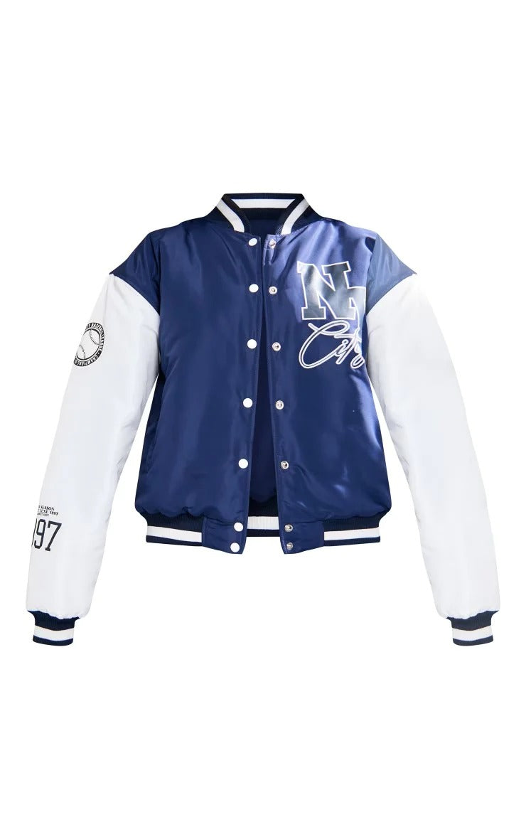 Give your everyday look an edge with this navy ny graphic bomber jacket. This unreal jacket will have heads turning wherever you go. In a navy hue and a 'NY' graphic, this jacket will earn you some major styling points this season. In a bomber style, this jacket is perfect for pairing with your off-duty outfits. Style with some wide-leg pants and a white top to take your look to the next level.