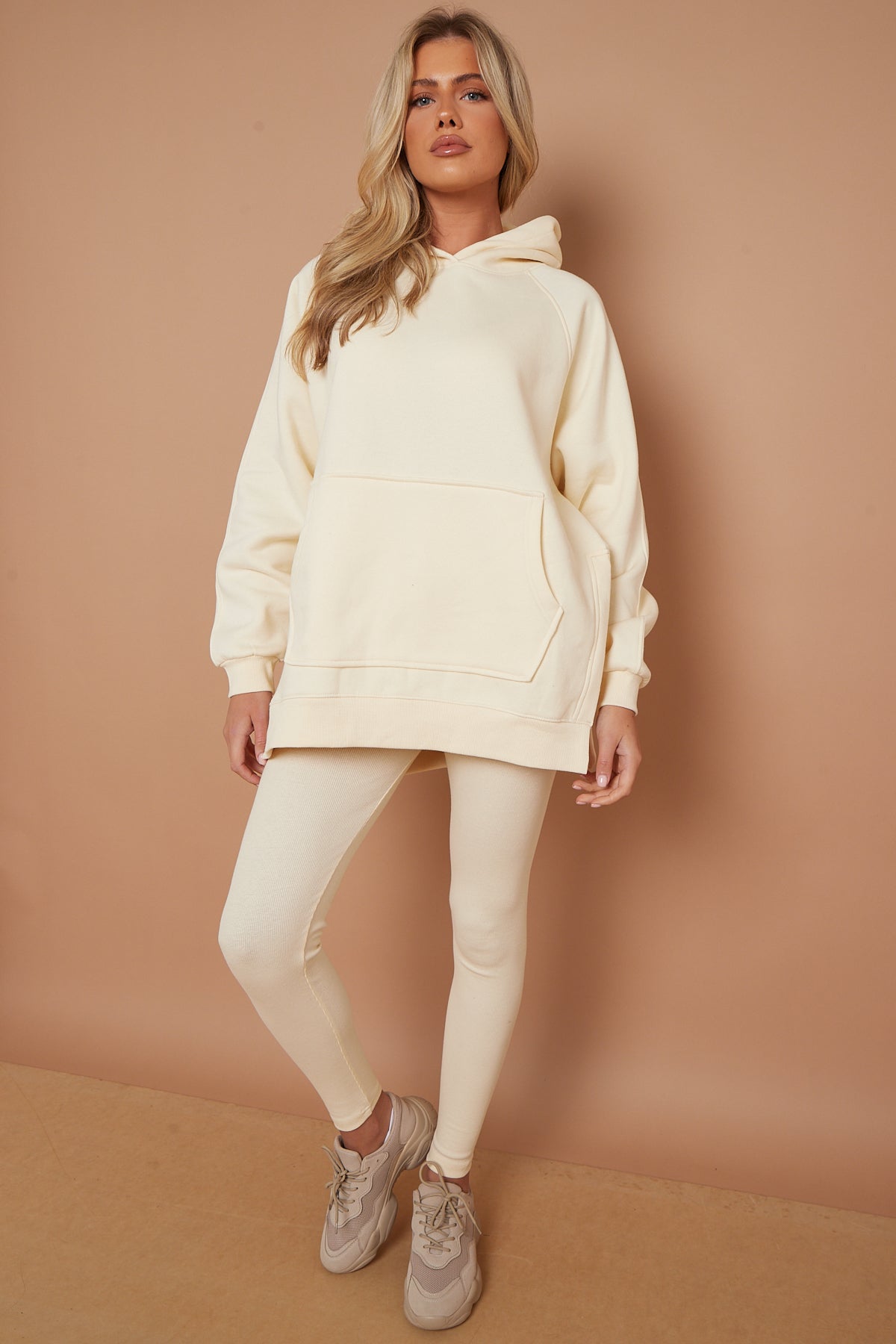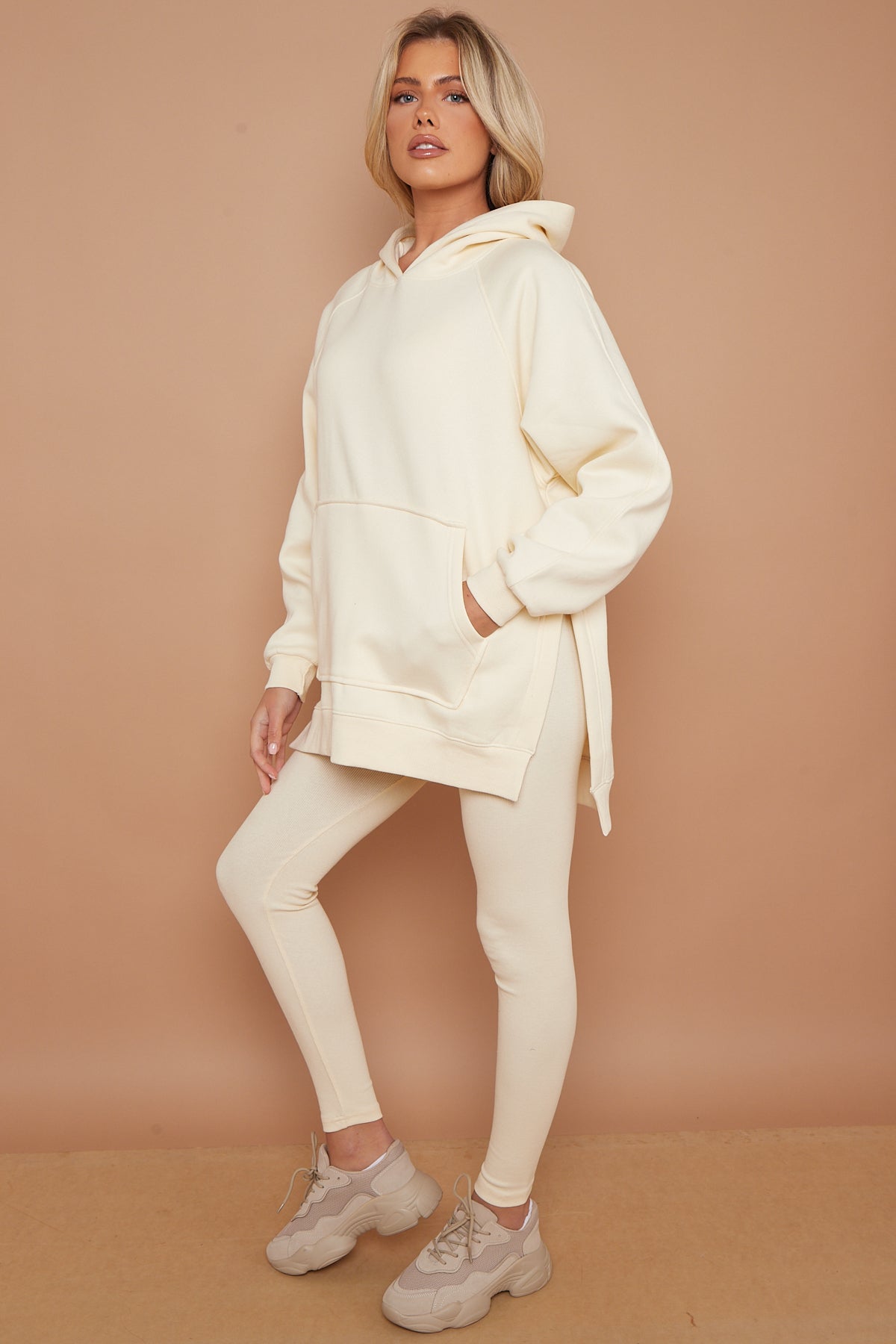Hoodie and leggings set. This oversized hooded sweatshirt and matching leggings set is the outfit, you must have in your wardrobe. This hoodie and leggings set features an oversized hooded sweatshirt with kangaroo pockets side split detail and matching high waist rib leggings. Style this two-piece hoodie and leggings set with fresh kicks to complete the look we love. This matching hooded sweatshirt and leggings co-ord set is also available in other colors.