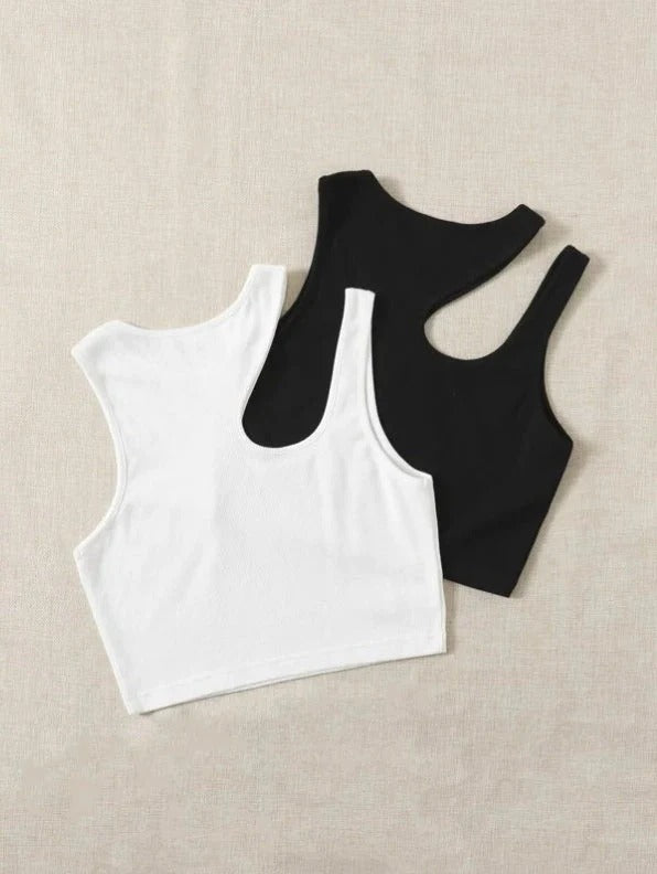 PACK OF 2 CUT OUT RIB-KNIT CROP TOP - BLACK/OFFWHITE