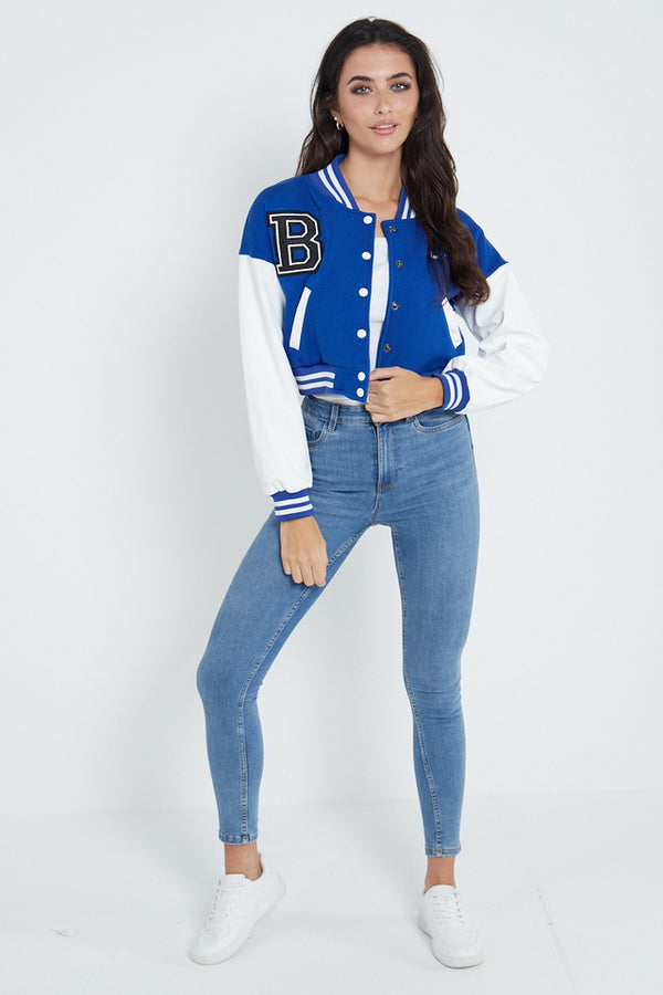 ROYAL BLUE VARSITY GRAPHIC FAUX LEATHER SLEEVE BOMBER JACKET