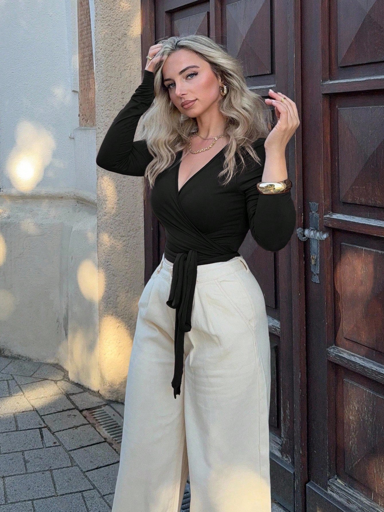 SOFT WRAP V-NECK LONG SLEEVE CROPPED TIGHT TOP