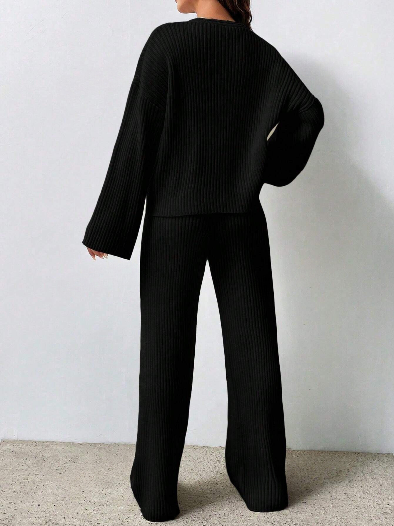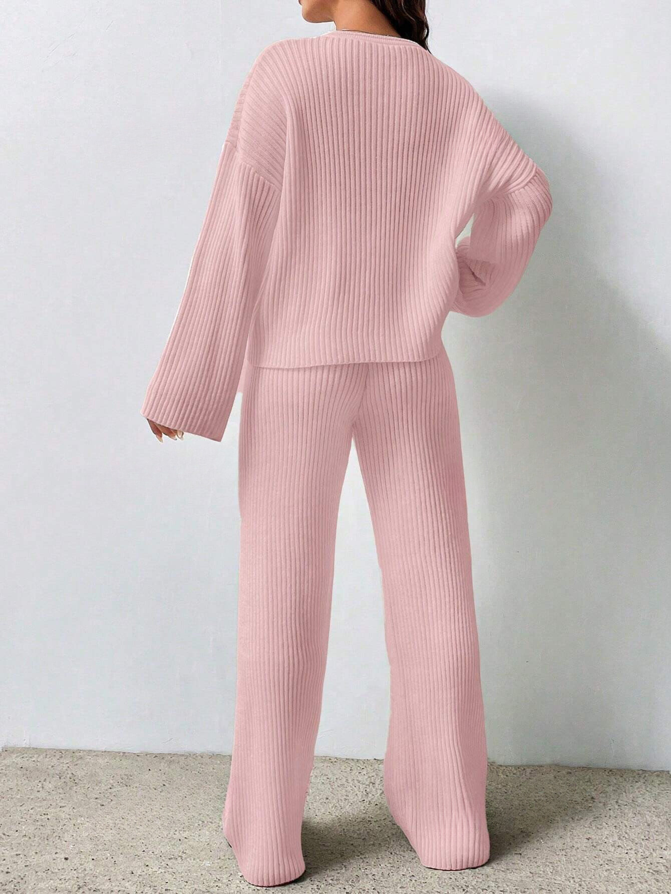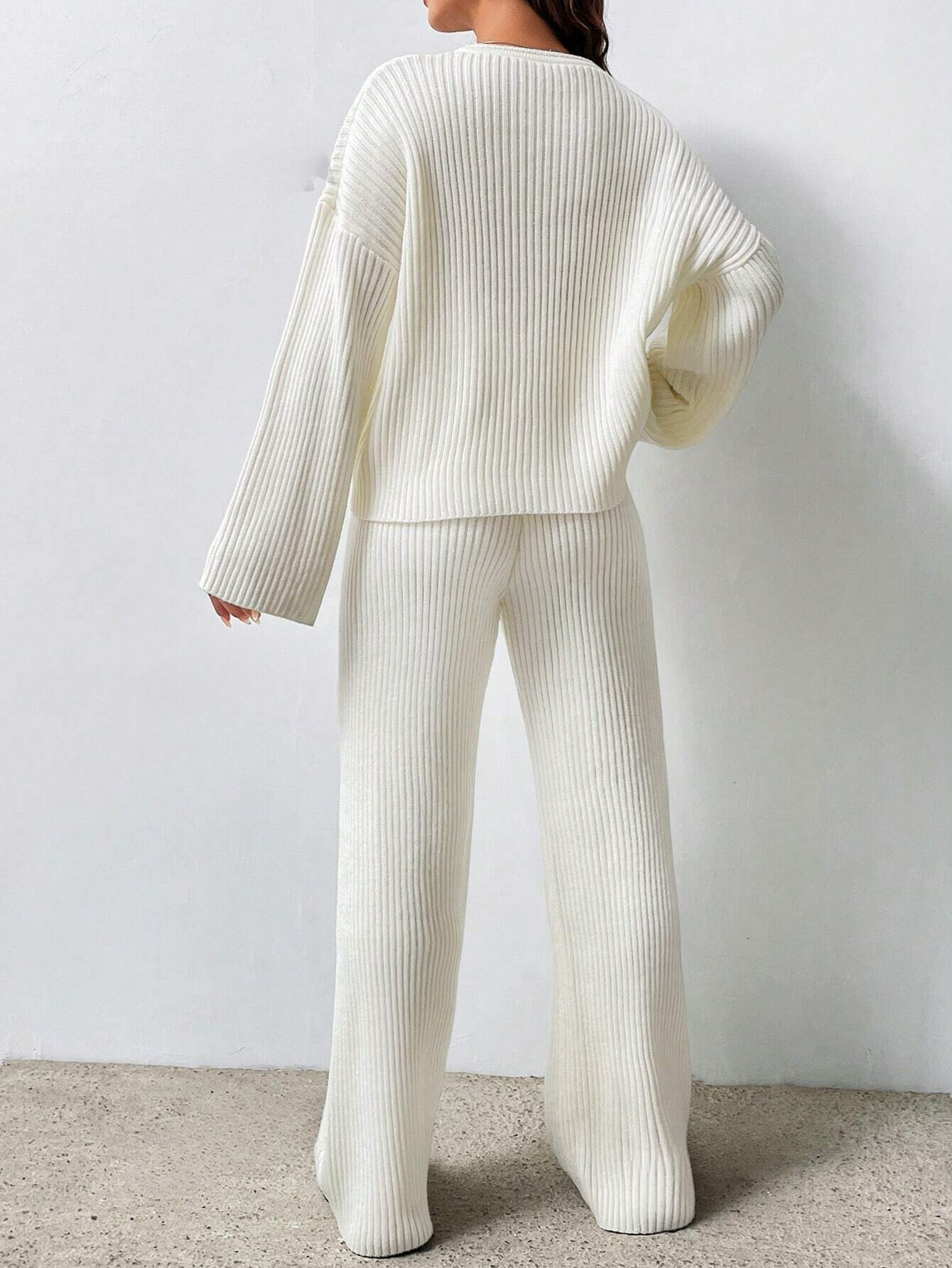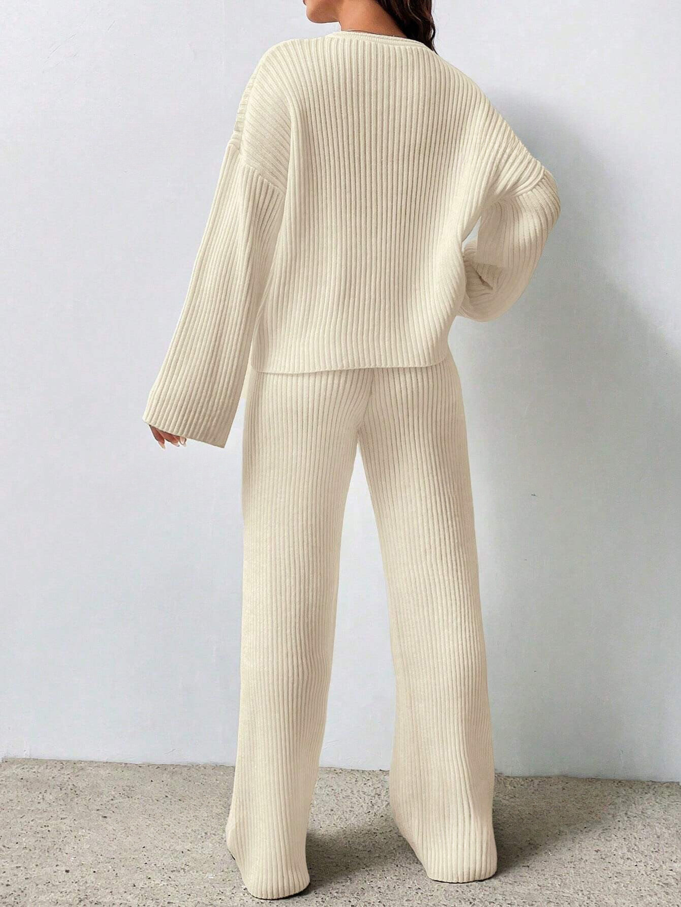 SOLID COLOR DROP SHOULDER SWEATER AND KNITTED WIDE LEG PANTS