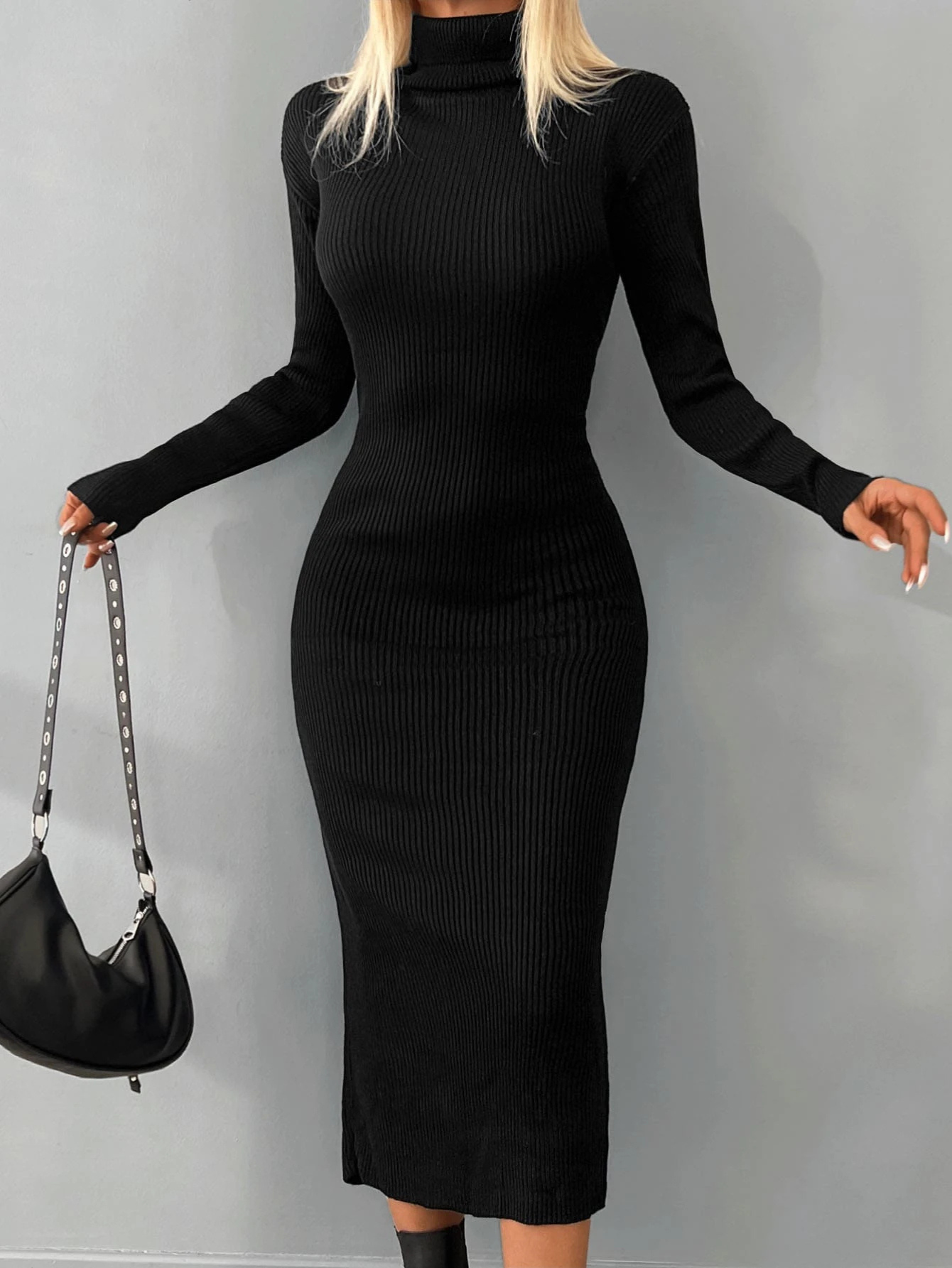 TURTLENECK RIBBED KNIT BODYCON DRESS