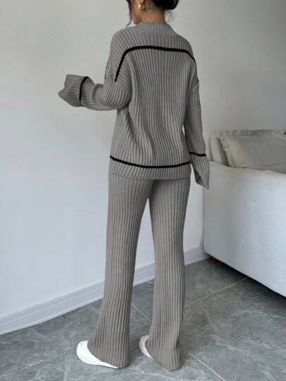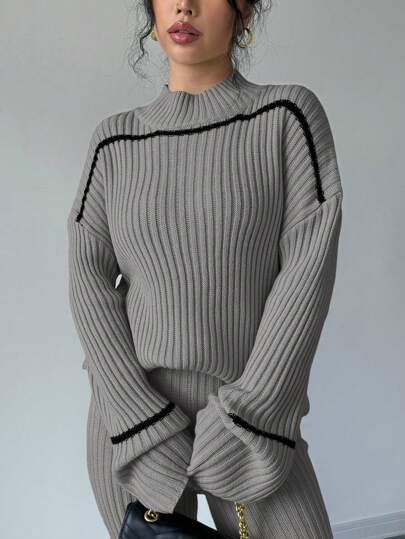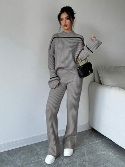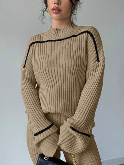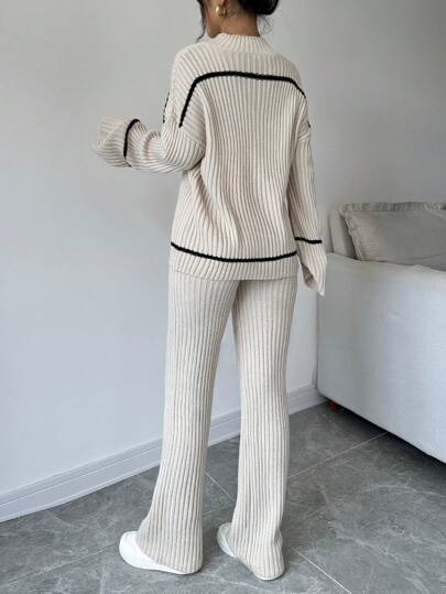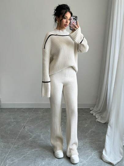 WOMEN CONTRAST STRIPED PRINT TURTLENECK SWEATER AND SOLID COLOR PANTS SET