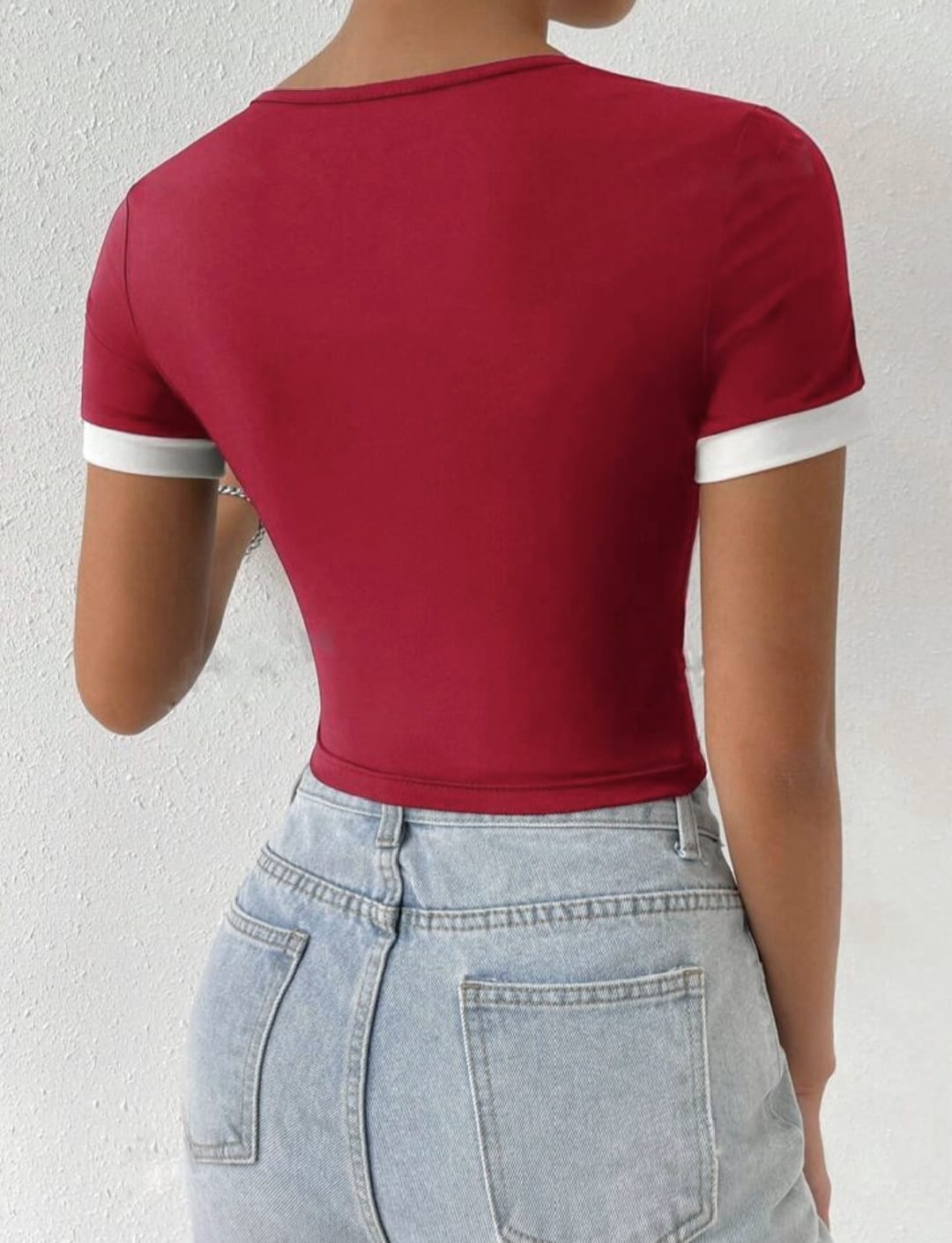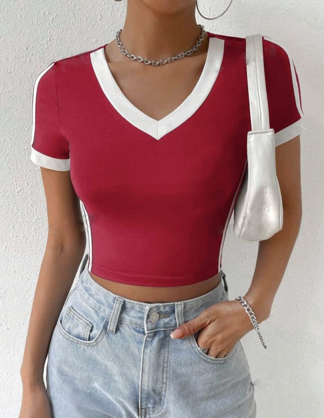 WOMEN'S CONTRAST COLOR V-NECK SHORT SLEEVE T-SHIRT