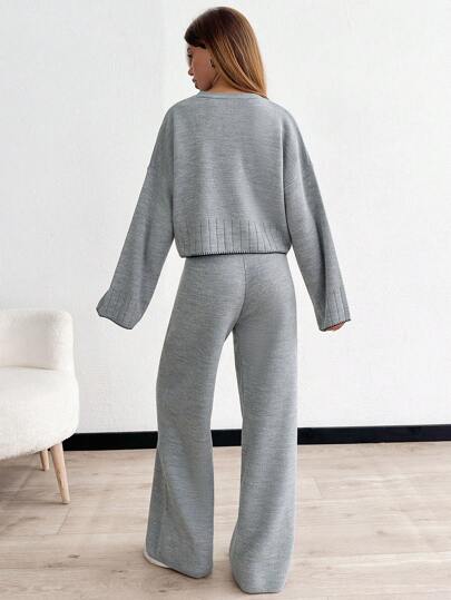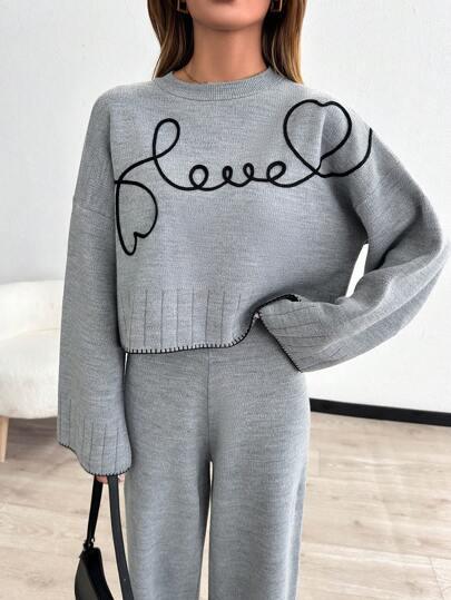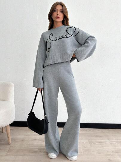 WOMEN'S EMBROIDERY DETAILED ROUND NECK BELL SLEEVE PULLOVER AND WIDE LEG SWEATER PANT TWO PIECE OUTFIT SET