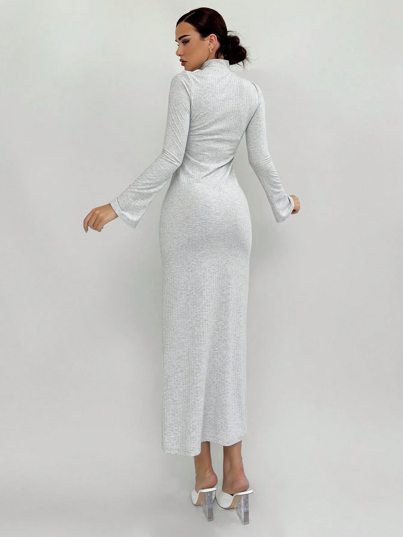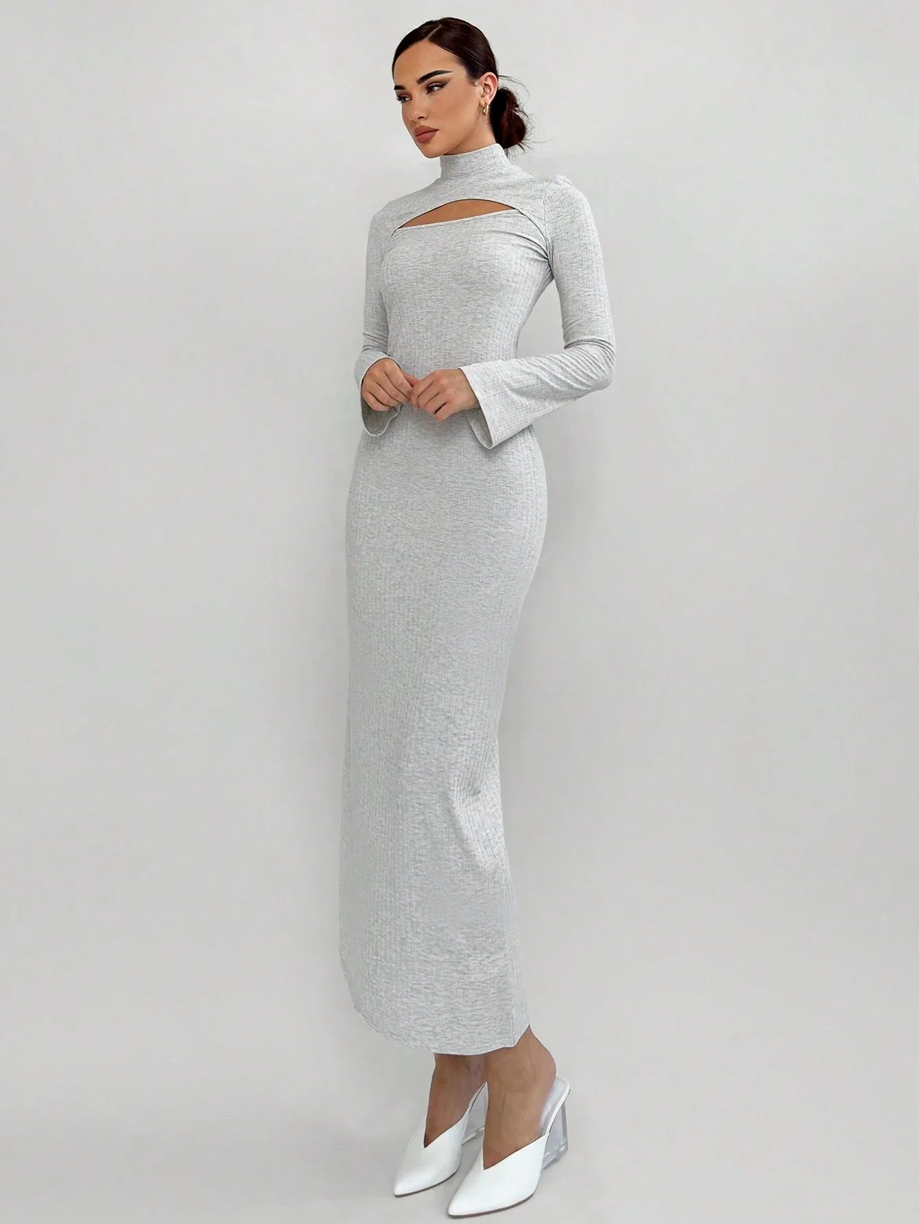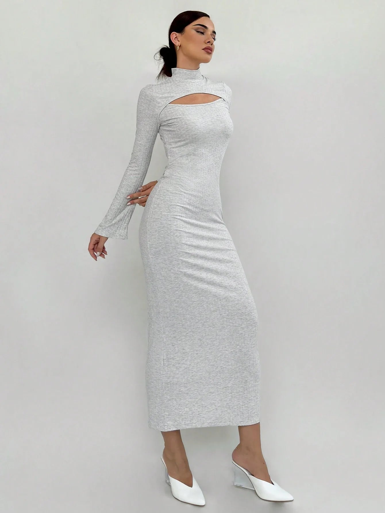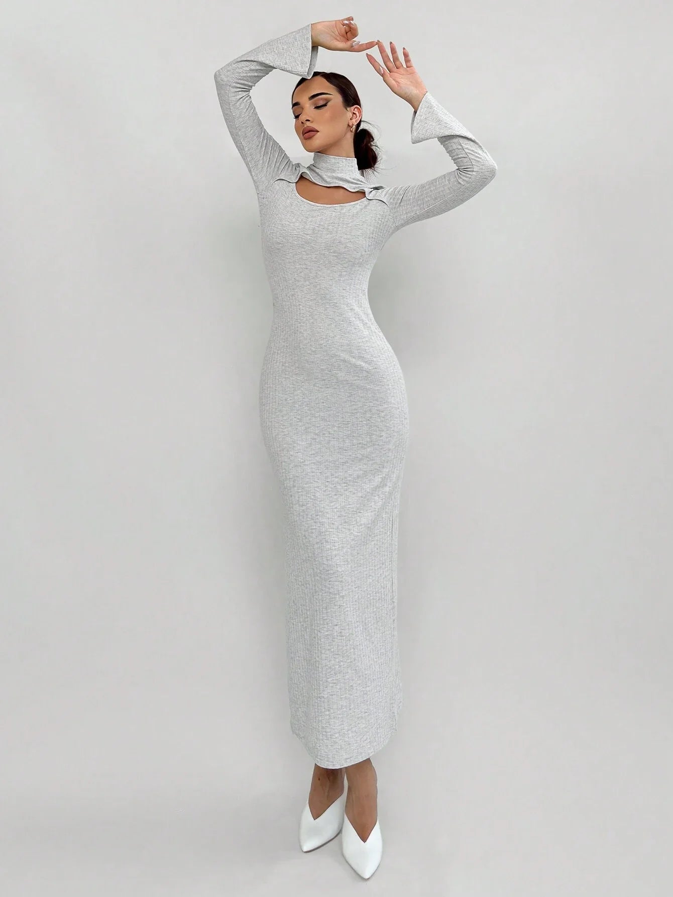 WOMEN'S HOLLOW-OUT FITTED RIB-KNIT LONG SLEEVE DRESS