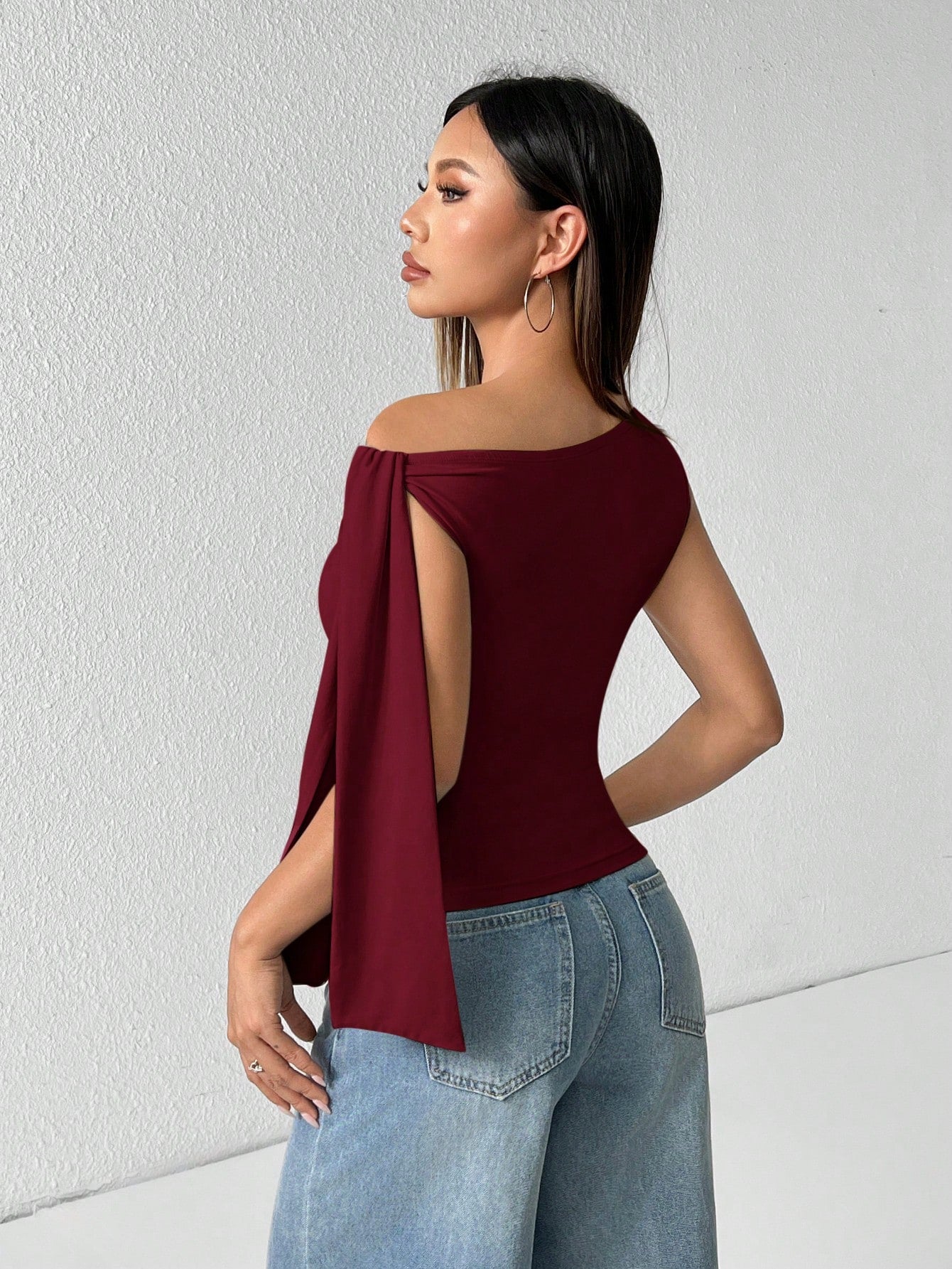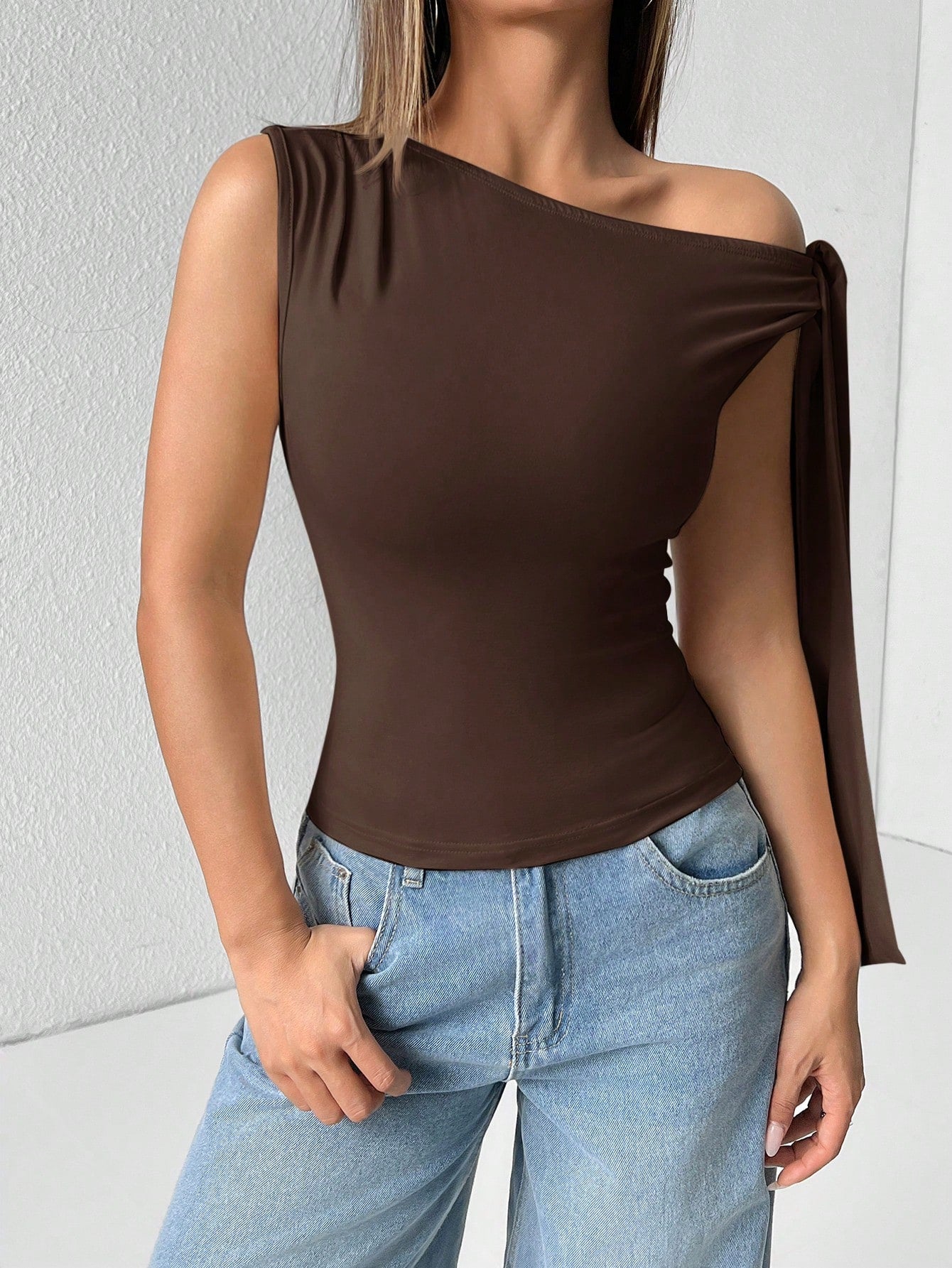 WOMEN'S SOLID COLOR MINIMALIST OBLIQUE COLLAR TIED BLOUSE