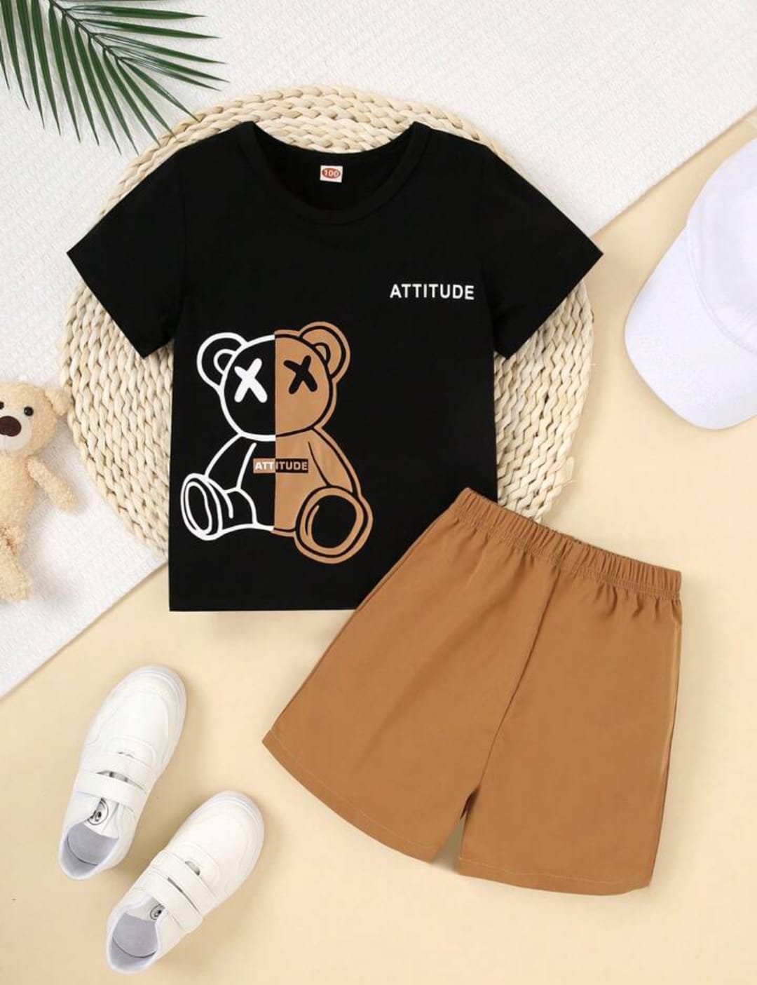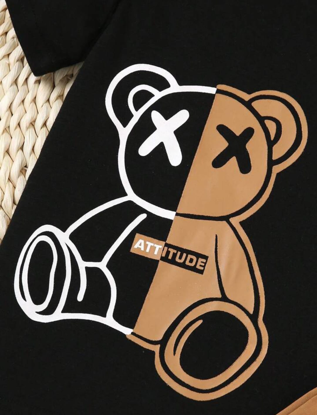 YOUNG BOY TEDDY BEAR & LETTER PRINTED SHORT SLEEVE T-SHIRT AND SHORTS SET